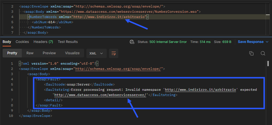 Se un'applicazione SOAP riceve un messaggio basato su un altro spacename, la stringa "URI" non coincide, deve generare un errore. Questa regola garantisce che tutti i messaggi conformi utilizzino esattamente lo stesso spacename e lo stesso schema XML , e quindi le stesse regole di elaborazione.